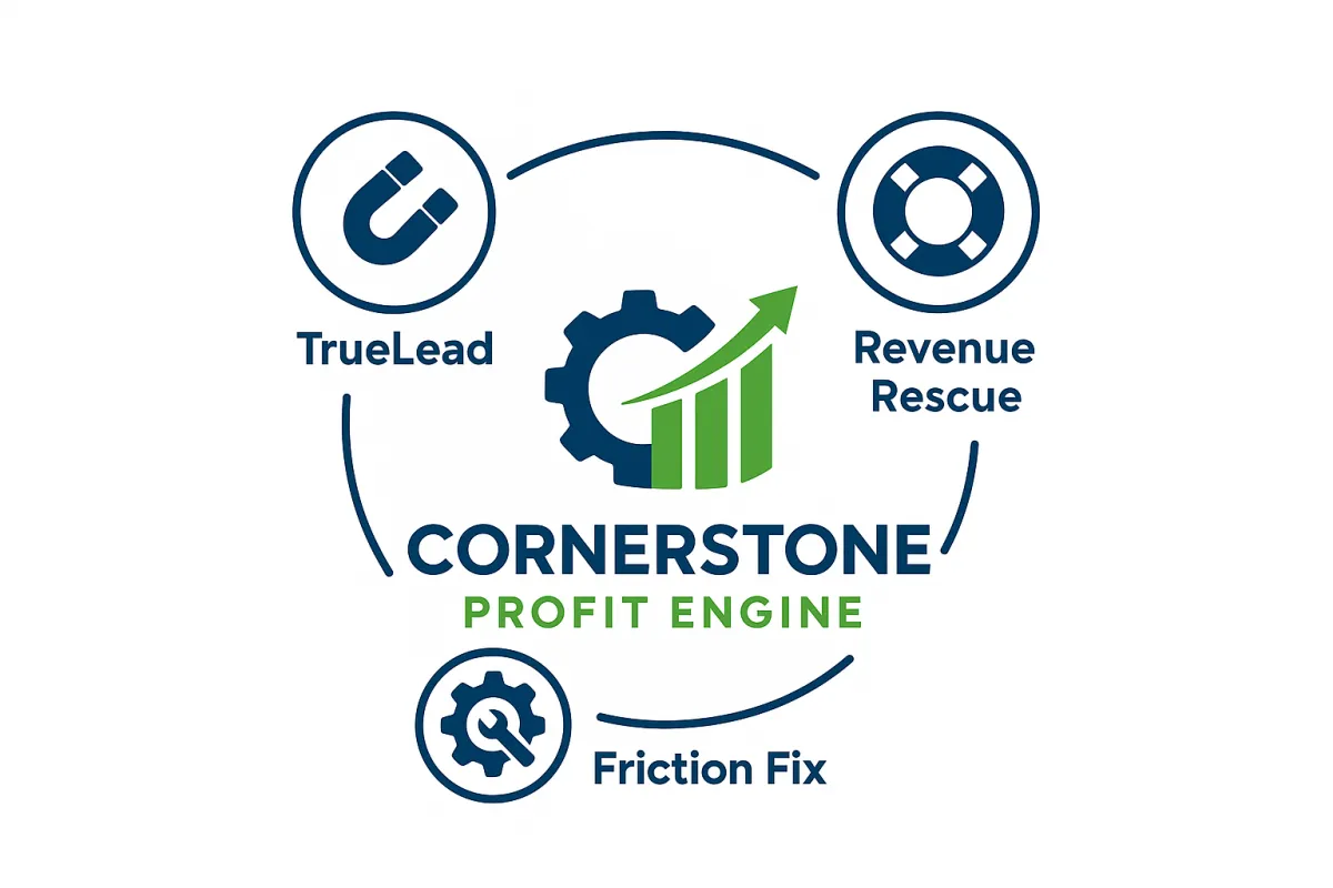 Most businesses stall because they’re missing one of these critical elements. With the Cornerstone Profit Engine, you have all three working in sync — delivering reliable leads, maximizing revenue, and smoothing every step of the journey. That means less wasted effort, more predictable sales, and a business that runs like a well-tuned machine.